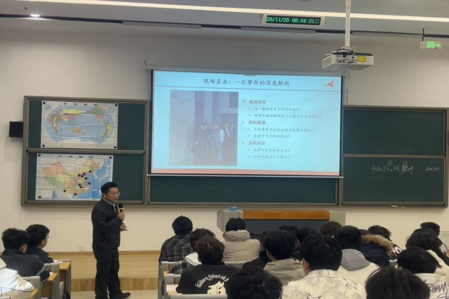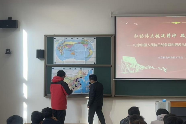 课程伊始,周书记创新教学形式,突出学生的主体地位,邀请学生在地图上标注重要抗战地点。同学们依次标出卢沟桥、平型关、台儿庄等具有重大历史意义的抗战地点,通过互动参与的方式,让学生直观了解抗日战争的主要战场分布和战略格局。