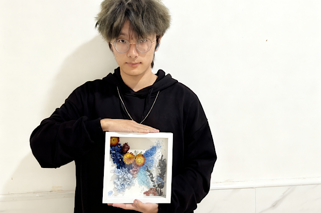 活动现场,绣球的淡紫、尤加利的浅绿、雏菊的暖黄等干花材料,与白框、镊子、胶水等工具有序陈列,暖光裹着花材的柔色,消解了秋日的凉意。在社团负责人的引导下,参与者们以干花为“羽”,亲手裁剪、拼贴出形态各异的蝴蝶:渐变蓝干花铺就的蝶翅沾着细碎晶闪,似落了秋夜的星;紫调花簇衬底的蝶身裹满花绒,晕开朦胧的柔意;融入金箔的作品则让蝶翅泛着暖光,像把春日余晖封进了相框。从勾勒轮廓到调整花材位置,成员们指尖轻动,零散的花材便化为一只只“春日蝴蝶”,停落在白框之中。