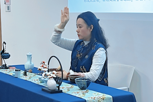 她从宋代点茶的历史渊源、贡茶“龙团凤饼”的精制工艺,到茶百戏九大工序、七汤点茶法的技法精髓,再到茶筅、茶盏等器具的使用要领,逐一细致阐释。尤其对“一汤调膏如融胶、二汤击拂珠玑磊落”的七汤技法拆解,让同学们直观感受到宋代点茶的精妙讲究,为后续实操环节筑牢了认知基础。