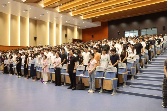 伴随着激昂的旋律,全体师生起立奏唱中华人民共和国国歌,庄严肃穆的氛围中,爱国情怀在每一位新生心中悄然扎根,为本次开学第一课奠定了浓厚的爱国教育基调。