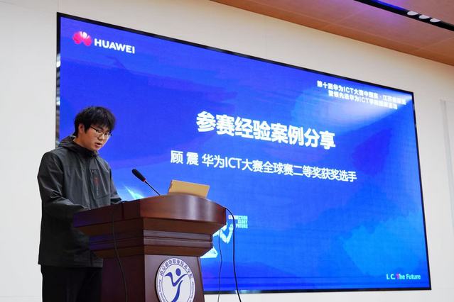 合影结束后,华为ICT大赛路演正式开启。江苏万和系统工程有限公司渠道经理朱庆详细介绍了第十届华为ICT大赛的赛事亮点、参与路径及备赛建议,激发了学生的参赛热情。路演尾声,华为ICT大赛全球赛二等奖获奖选手顾震分享过往参赛经验与成长感悟,为在场同学提供了实用的备赛指南。