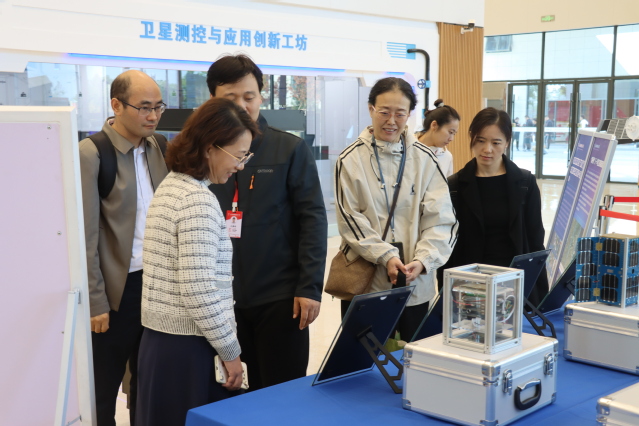 实地参观环节中,来宾们首先走进航天科普馆,馆内陈列的高精度火箭模型、卫星仿真设备等展品引发大家浓厚兴趣,纷纷驻足观摩询问。信息工程系主任王国珍结合展品细节,系统讲解了各类航天设备的技术原理、研发历程及应用场景,让来宾们对航天领域知识有了更直观的认知。在卫星测控与应用创新工坊,来访者近距离察看教学仿真卫星、全流程测控终端等核心设备,深入了解从卫星研发设计、仿真测试到实际应用的完整培养链条,对该校实训教学的专业性给予高度评价。