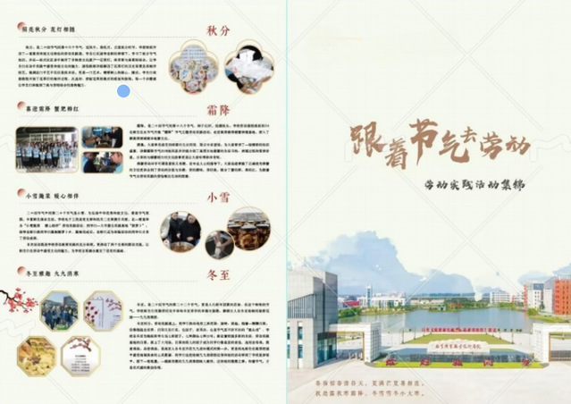 冬藏蓄力量:立冬补冬,跟着传统技法拔萝卜、腌冬菜让学生在田间劳作中与手工腌制实践中感受节气魅力;“大雪留雅韵,墨香拓古情”,让学生了解大雪节气的美与劳动的趣;冬至学生齐聚一堂拼贴五谷,在“万物收藏、自然馈赠”中体会团队协作的快乐,让温暖伴冬行。