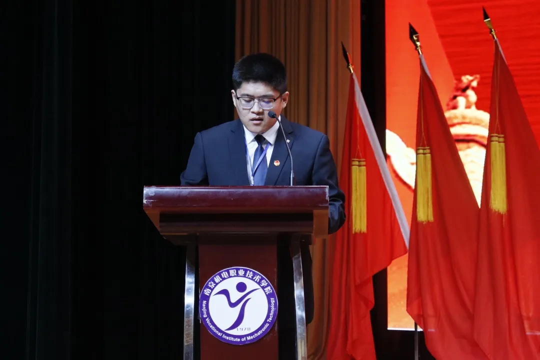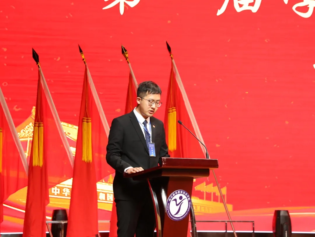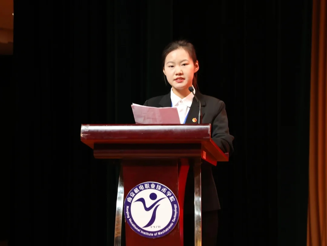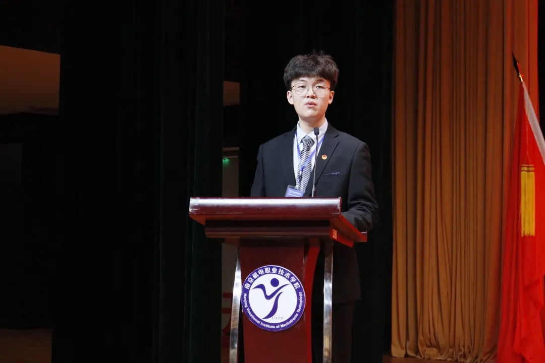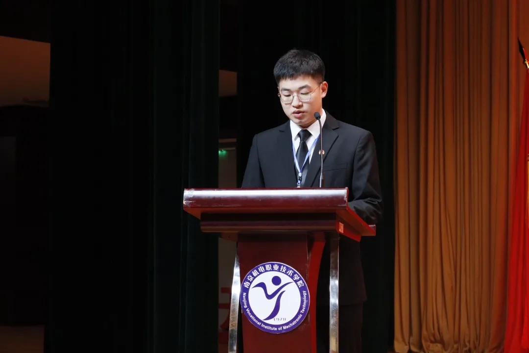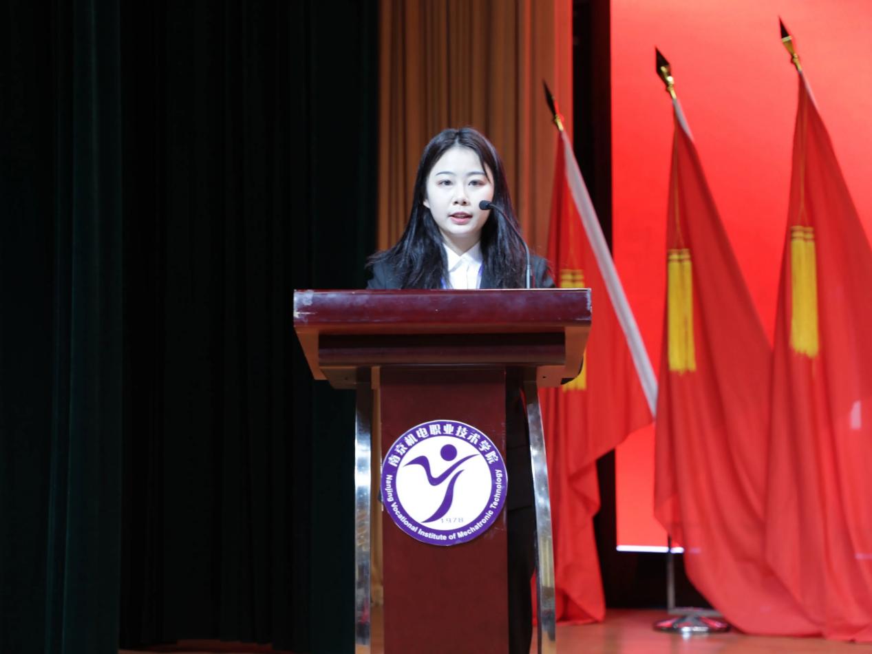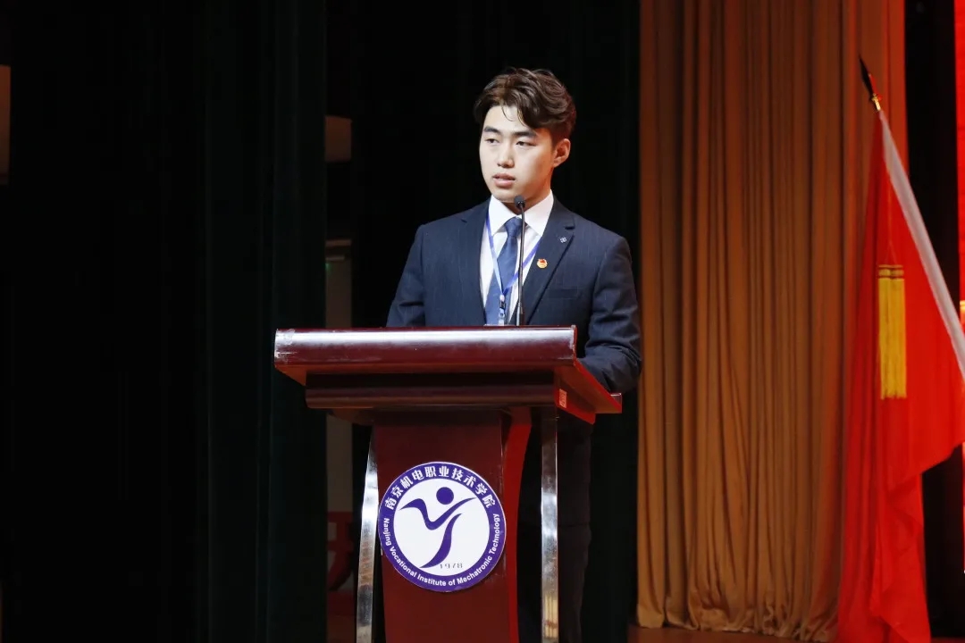 潘婷同学宣读大会倡议书。她向全体学生发出倡议,要坚定理想信念胸怀爱国主义热情,树立正确的职业观,勤奋学习,锐意进取,争做全面发展高素质人才,不断开拓创新,以身作则,为建设有爱有趣有情怀的“四新”机电贡献青春与力量。