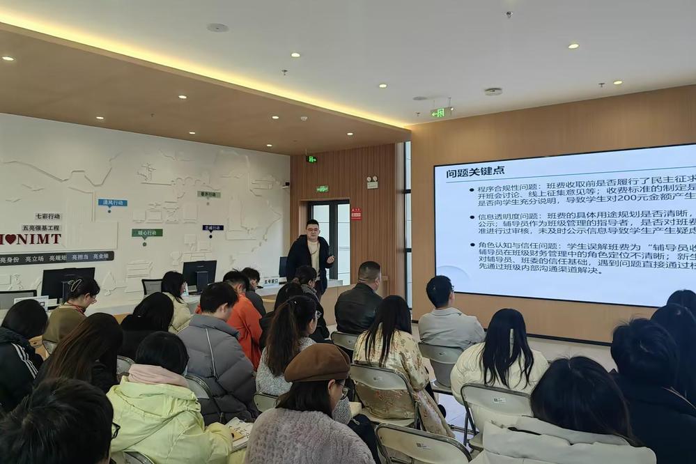 三位辅导员结合工作实际进行了案例分享。周笛老师围绕“入团积极分子考试公平性问题”,阐述了考试监督、制度完善与技术防弊相结合的处理路径;俞青老师以“团支书岗位倦怠”为例,探讨了学生干部心理疏导、学业工作平衡与长效赋能机制;殷翠松老师则通过“班费收取引发的信任危机”,强调了程序规范、信息公开与信任建立在新班级管理中的重要性。