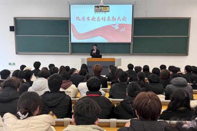 2026年1月6日,校学生会在善学楼铁军学堂召开2025年度总结表彰大会,学生工作处处长张宝中、指导老师钱莉娇与全体成员齐聚一堂,一同回首过去一年的拼搏旅程,嘉奖杰出榜样,憧憬未来发展的全新篇章。大会由四项主要议程组成,现场气氛庄重而热烈。
