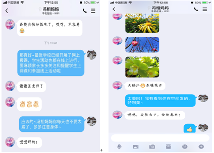 疫情期间,为了了解学生在家状态,我系辅导员每日坚持和每个家长进行沟通。辅导员王晨歌在于冯相同学家长沟通时,冯相同学的家长说:“在家隔离期间,我和孩子在家多了许多相处和交流的机会,冯相还在家跟我学习做菜,他说自己做了几顿饭之后才发现家长有多辛苦,现在在家经常主动帮我做家务,我感到非常暖心。”辅导员还了解到,在疫情期间,冯相严格服从社区安排,拒绝一切会对社会添乱的活动,家长对学校开展网上授课和线上学生活动表示肯定与支持,并表示非常感谢在特殊时期学校以及辅导员对学生的严格要求和关心关爱,祝愿疫情早日结束,每个人都平安健康。