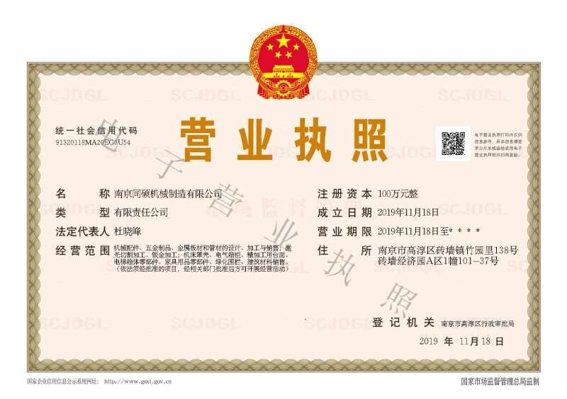 2019年11月,由我、万晨、李云松三位合作人共同组成的南京同硕机械设备有限公司正式成立于南京市高淳区。公司经营范围包括机械配件、五金制品、金属板材和管材的设计、加工与销售;激光切割加工、钣金加工;机床罩壳、电气箱柜、精加工用台面、电梯箱体零部件、家具用品零部件、绿化围栏、建筑材料销售。