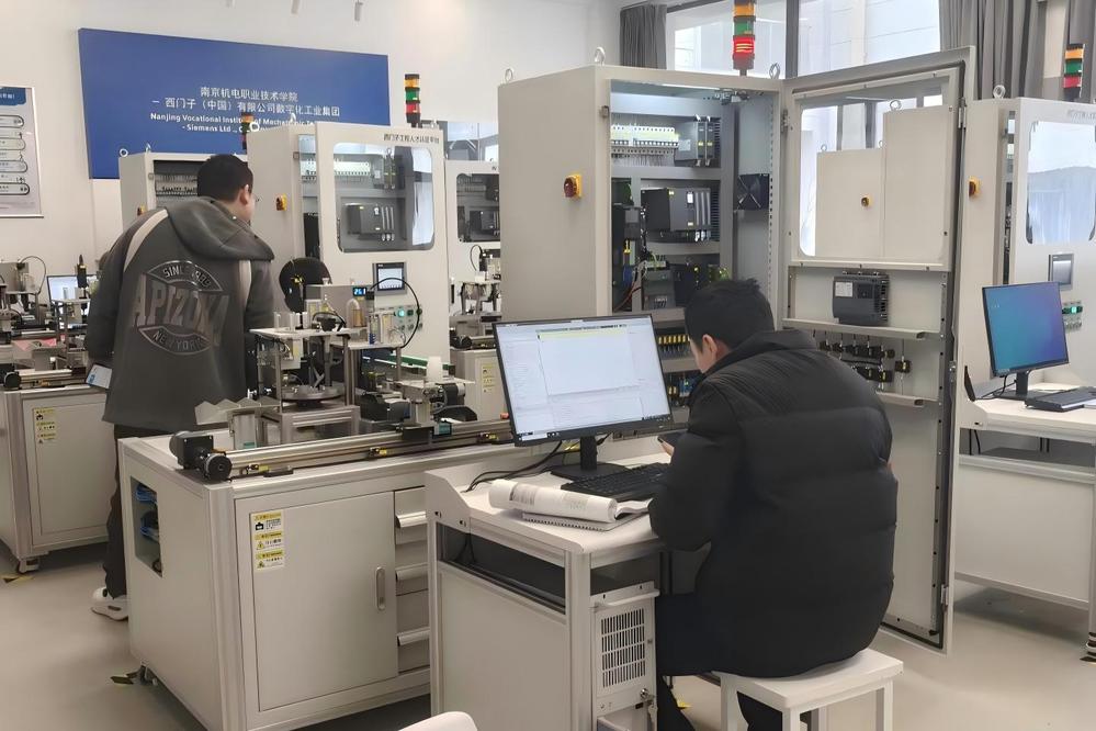 作为西门子官方授权认证中心,敏行楼201实训基地配备了包含S7-1500、S7-1200、G120变频器、V90伺服、HMI人机交互系统的综合电气控制柜10台,并集成了灌装-搬运-装配-分拣全功能产线。培训紧密围绕《中国制造2025》技术路线,通过“理论强化+单元实训+产线联调”三维模式,累计完成工业控制系统集成类任务32项(如供料站GRAPH编程)、产线协同运维项目9项(含PROFINET网络优化),关键能力达标率100%。系统提升教师在工业控制系统集成、产线协同运维领域的能力。